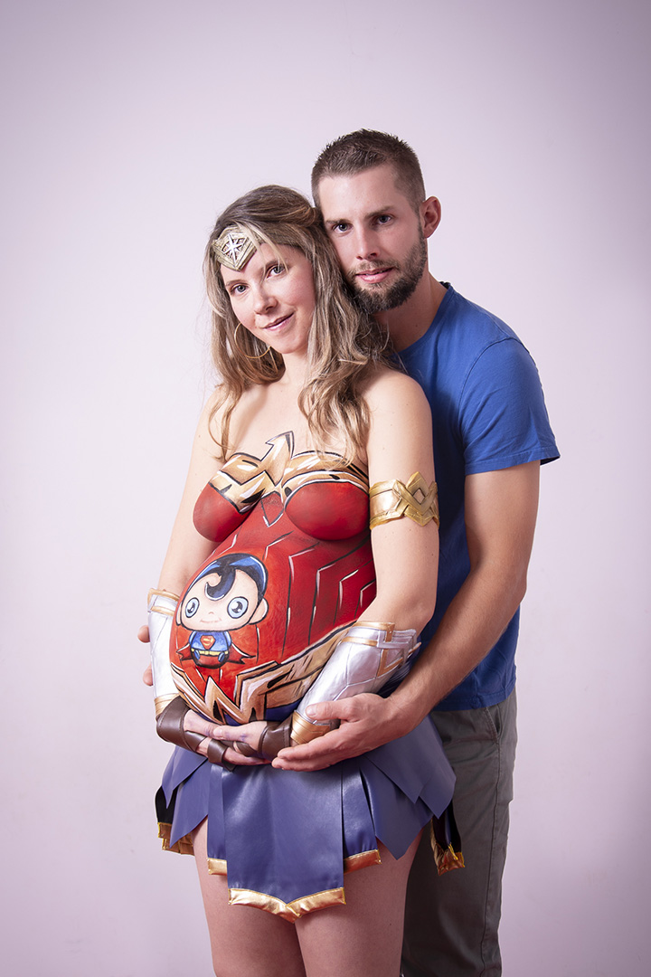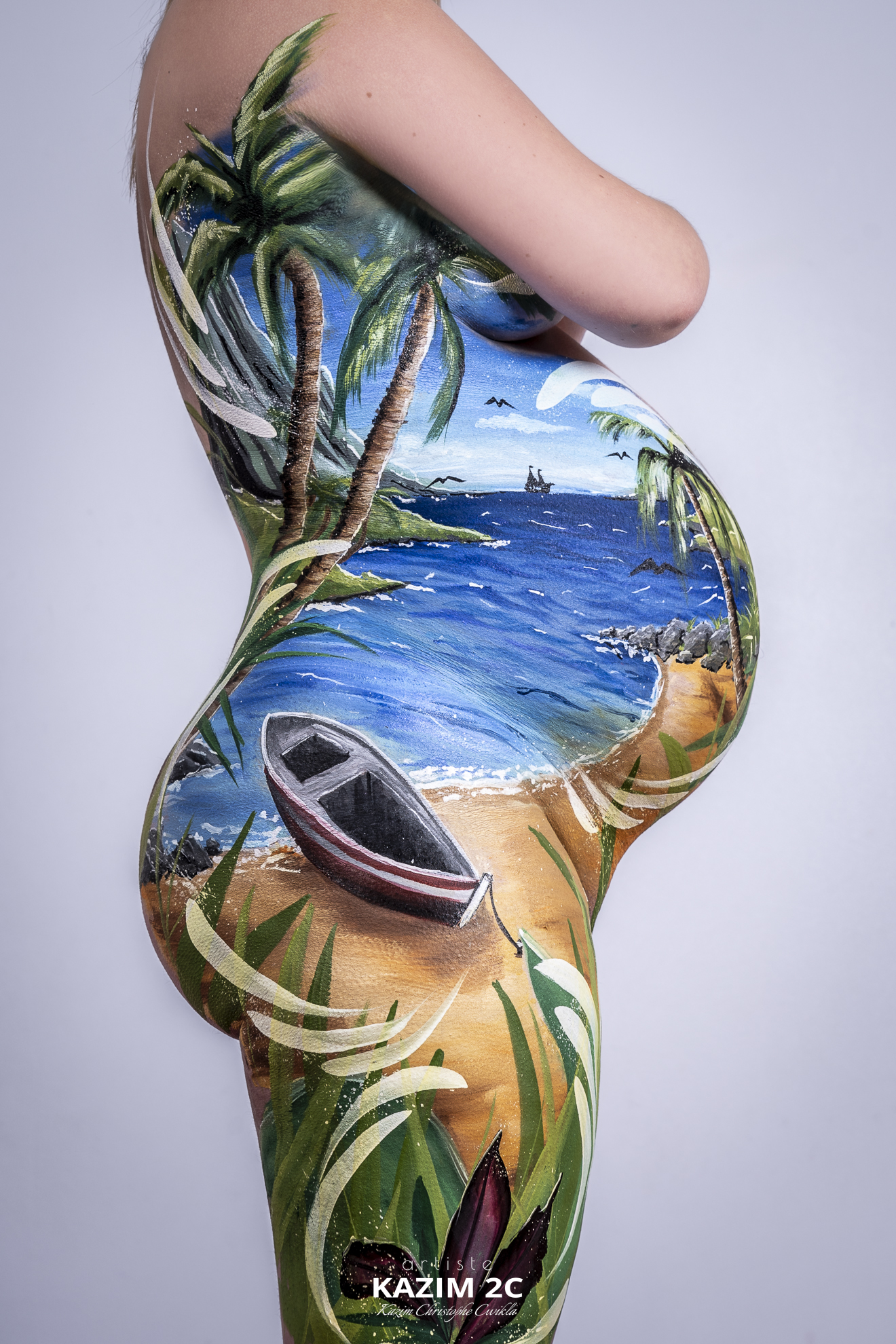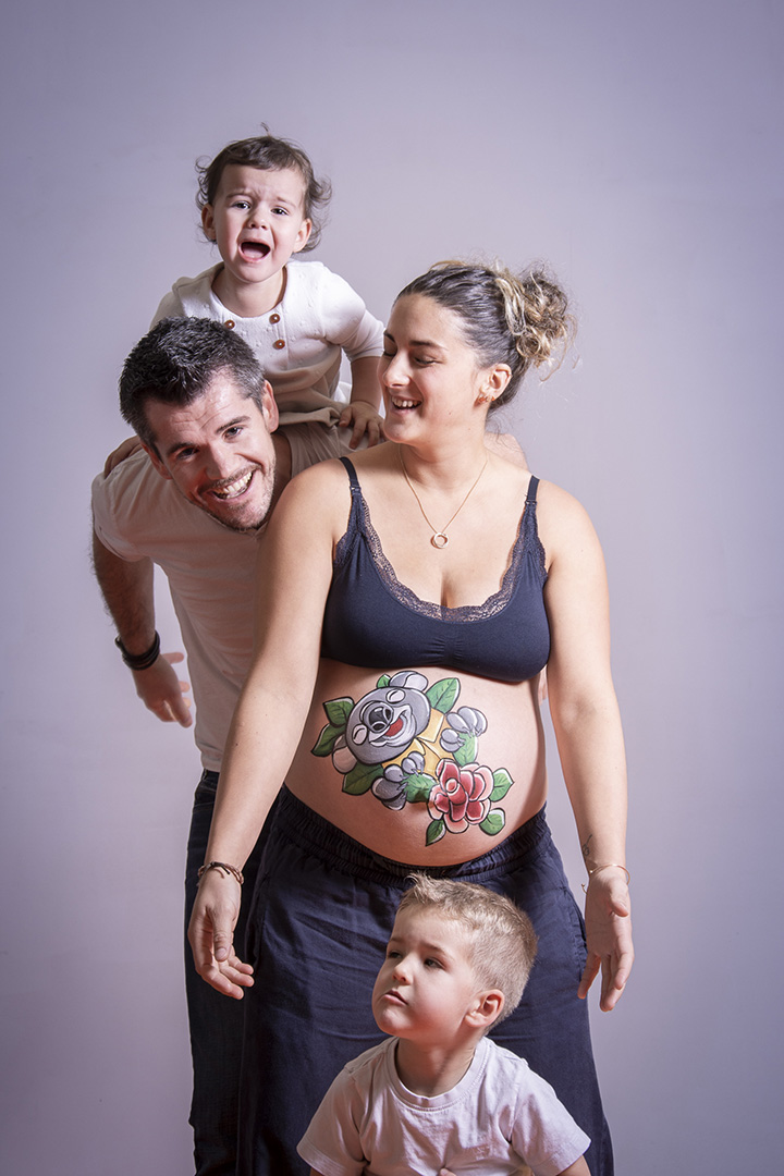 Votre séance se déroule idéalement au cours du 7eme mois. Le temps nécessaire pour réaliser la peinture est la séance photo est de 3h environ pour un ventre, entre 3h et 4h pour un buste complet.