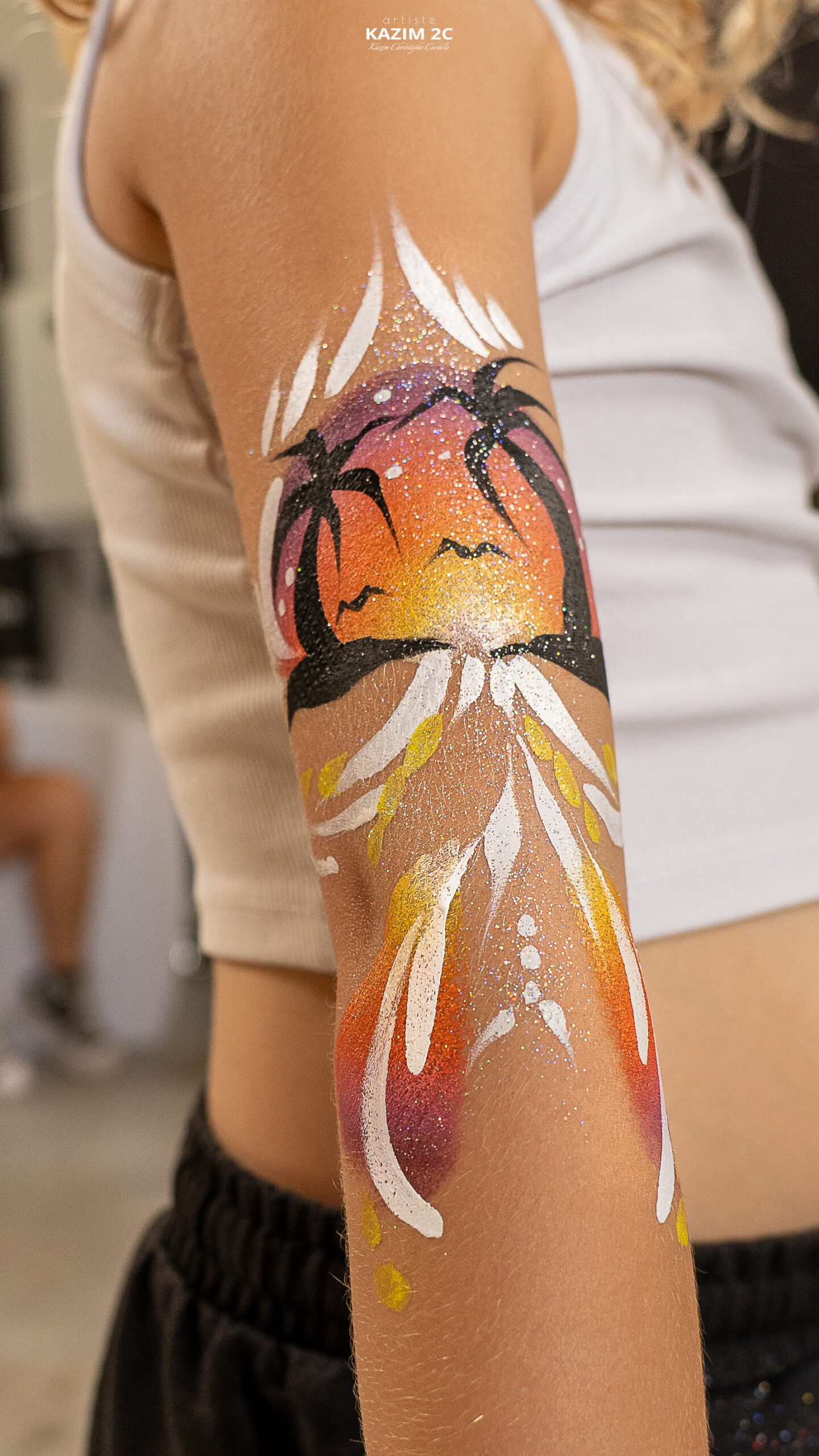 Et pour les enfants qui n’aiment pas maquiller leur visage je propose aussi les tatouages en paillettes et des arabesques sur le bras.